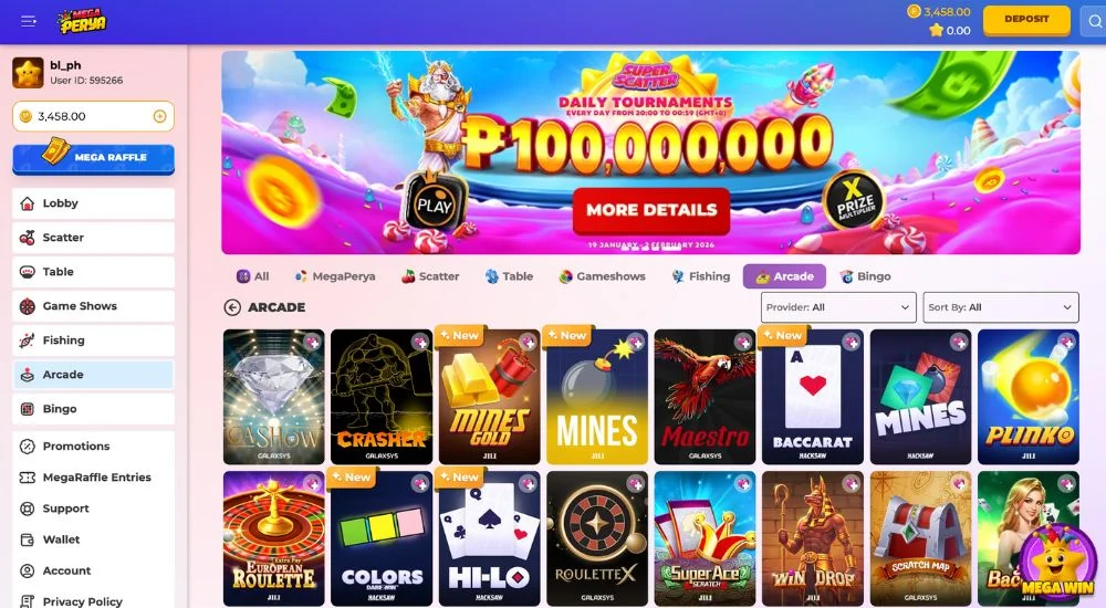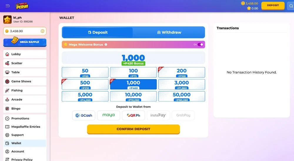 MegaPerya supports popular Philippine payment methods, including GCash, Maya, GrabPay, QRPH, and InstaPay. All deposits are processed in Philippine Peso (PHP) and are usually credited quickly.