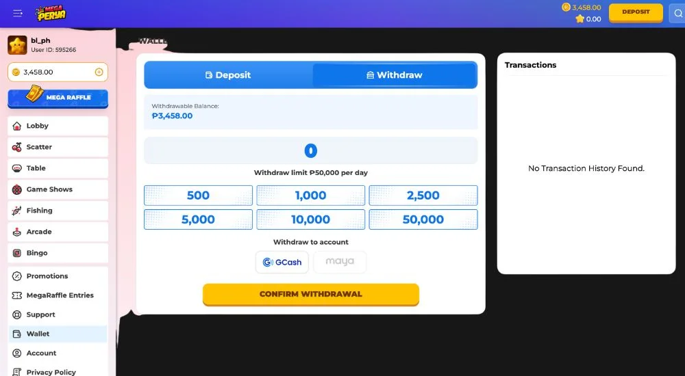 Withdrawing from MegaPerya is straightforward and keeps things local. Cash-outs are available via GCash and Maya, making the process familiar for Filipino players.